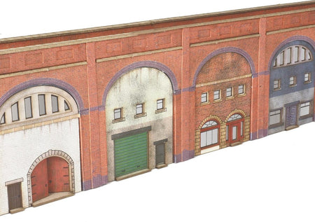 8 half relief shop/garage facades that fill the railway arches on existing Metcalfe Viaduct Kits. Can be used as fronts or can be combined back to back to create a complete under arch unit.