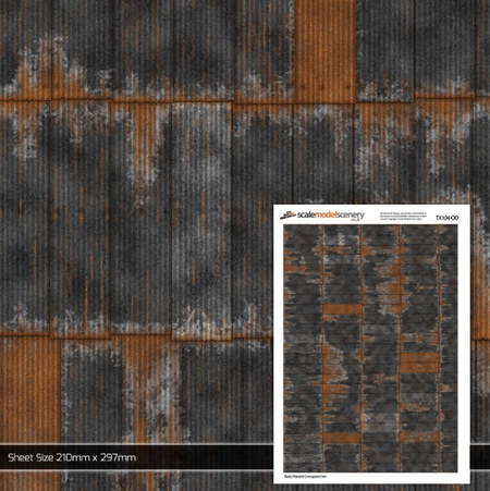 Add realistic roofing and cladding to your industrial, quarry & farm buildings such as barns etc with this pack of 5 A4 sheets (210mm x 297mm) of photo-realistic, rusty, black painted & weathered corrugated iron texture paper. Great for adding a touch of authenticity to your model buildings, with realistically weathered corrugated iron panels including intricate details such as fixings, rust patches, peeling paint and slightly damaged ends to the panels.